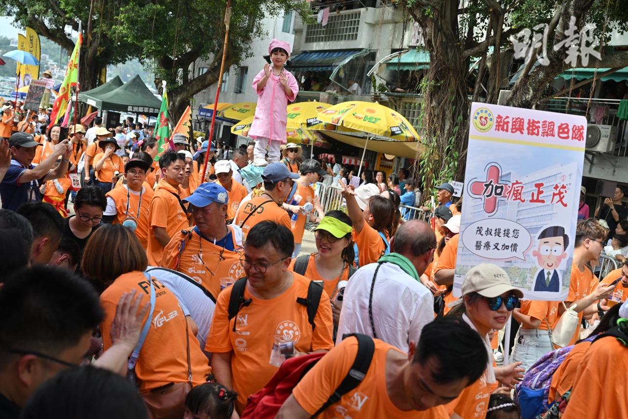 長洲太平清醮飄色巡遊今午(5日)舉行,大批市民在巡遊途經的路線等候。打頭陣的飄色造型,包括內地熱門電影《哪吒之魔童鬧海》主角「哪吒」及兩屆奧運金牌得主張家朗。亦有飄色主題談及時事,包括緬甸詐騙園區「KK園區」、急症室加價等。