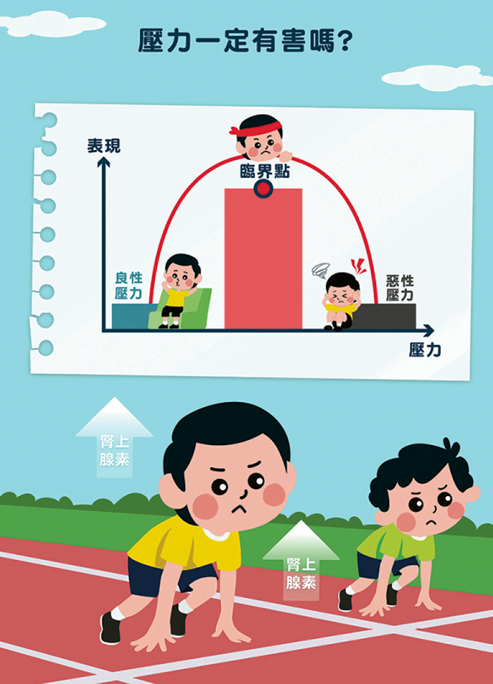 不過,如果孩子的壓力反應太大,就可能會喘不過氣來,心好像快要從胸腔跳出來一樣。孩子亦可能會覺得頭痛、心口痛和肌肉痛。良性的壓力反應本應是短暫,如果長期受壓,孩子的身體機能可能會變差,出現記憶力減退、認知能力下降、消化不良、發育不良等情况。所以,當孩子的壓力過了「臨界點」,又沒機會紓緩下來,表現就會得愈來愈差。所以,教導孩子理解、利用和處理壓力,實在是幫助孩子成長的重要一環﹗