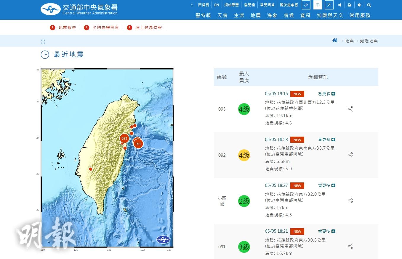 即時兩岸 花蓮連串8次有感地震 最大5.9級 (19:54) 發佈於 6 個月 前 2025 年 5 月 5 日 By 明報 台灣中央氣象署通報,5月5日晚間6時53分,花蓮東部海域發生規模5.9地震,地震深度6.6公里,暫時沒有損毀及傷亡報告。 當天晚間6時9分,花蓮東部海域發生規模5.5地震,隨後附近截至晚間7時15分再連續發生7次地震,最大5.9級。 中央氣象署地震測報中心主任吳健富表示,地震主因是板塊活動,研判這起地震屬於獨立事件。(中央社) 相關文章:台灣地震編輯推介花蓮 Up Next 俄專家:習近平訪俄正值世界政治的重要時刻 (16:42) 不要錯過 習近平對貴州黔西市遊船傾覆事故作出指示 3死60送醫另有14人正在搜救 (23:35) 繼續閱讀 贊助商 猜你喜歡 花蓮馬太鞍溪新堰塞湖溢流 溪水升0.7米便道毀損 (00:11) 花蓮「鏟子超人」傷口感染去世 (17:08) 花蓮中秋後復工復課 家長憂校園安全問題 花蓮逾400戶待清淤 目標中秋前復原 樺加沙重創台灣 18死107傷7人失蹤 (13:24) 花蓮災區泥水續湧 外地民眾馳援