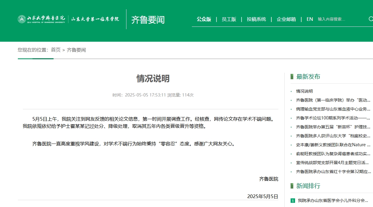 齊魯醫院官網5月5日通報,經核查,網傳論文存在學術不端問題,院方依規依紀給予護士霍某某記過處分、降級處理,取消其五年內各類晉級晉升等資格。