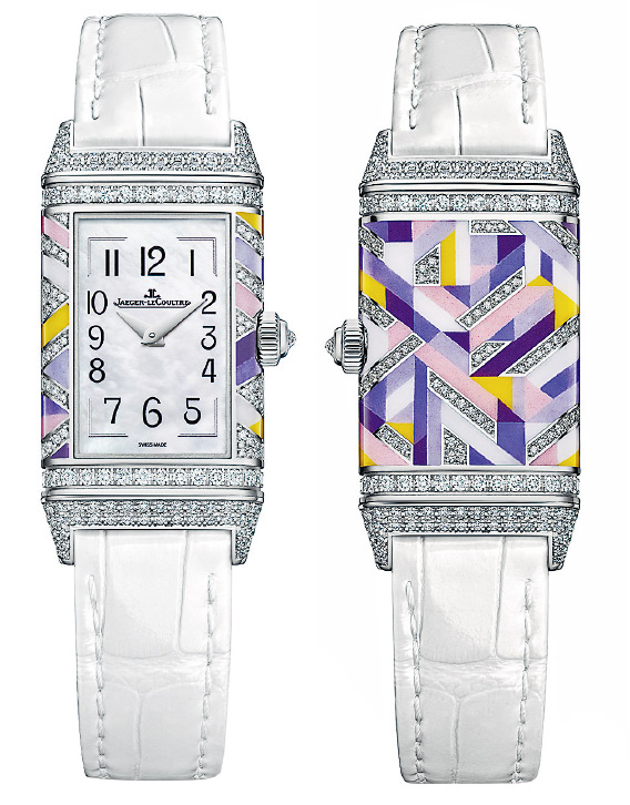 Jaeger Le-Coultre的新版Reverso One翻轉系列腕表以”Precious Colours”為主題,18K白金表殼結合大明火琺瑯微繪和鑲鑽工藝。腕表以灰色、淡紫色、粉紅色、深紫色、白色和黃色共6種琺瑯色調裝飾,突顯深度和動感的視覺效果。工匠需先在表殼金屬覆蓋一層透明琺瑯焙燒和兩層不透明白色琺瑯,分別晾乾後再焙燒;再採用筆尖極為纖細的黑貂毛畫筆以手工繪製不同色塊並多次焙燒,最後覆以多層透明琺瑯才完成。未定價(圖a)