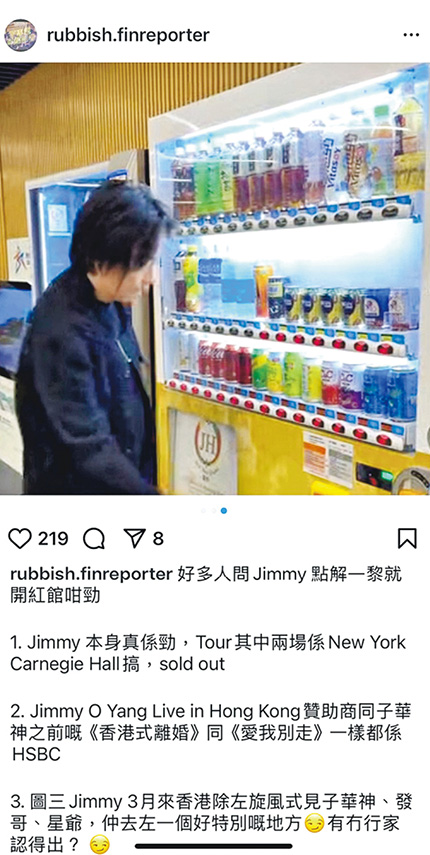 社交專頁「不專業財經記者」上載Jimmy 3月喺香港更新Instagram限時動態嘅截圖,Jimmy喺汽水機前停低,旁邊見到政府粵港澳大灣區標誌嘅顯示屏,睇落好似政總入面要拍卡先入到嘅電梯大堂。