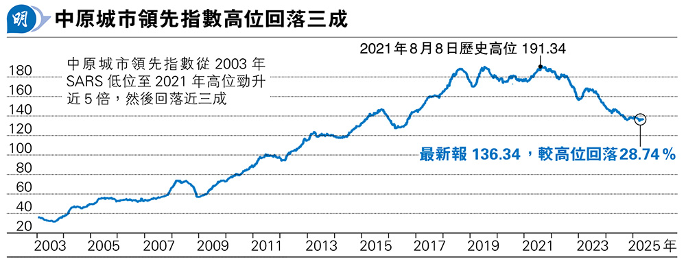 上周主講由中國國情研習促進會(香港)副會長范耀鈞主持「經濟『范』泛講」網上研討會時,雷鼎鳴被《Money Monday》問及,特首李家超2022年7月上任以來,如他上述建議般大幅增加土地供應,但由於期內息口高企及地緣政治等不利因素影響,至今住宅樓價已從2021年8月歷史高位回落近三成(見圖),影響所及,截至今年3月底負資產住宅按揭貸款宗數40,741宗,為2003年底以來最高,這導致負財富效應不利消費以至整體經濟,政府應否調整土地及房屋政策以穩定樓價。