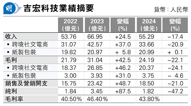 【明報專訊】吉宏科技(深:002803、下簡稱「吉宏」)上周通過港交所(0388)上市聆訊,未知公司會否選擇與「股王」寧德時代(深:300750)同期招股、正面對撼?吉宏業務可謂新舊經濟共冶一爐,經營跨境社交電商,同時亦保留紙製包裝業務。兩者業務性質完全不相同,但也未致於毫無關連,至少電商物流層面也涉及包裝物料。且從業績看,兩項業務似乎亦是「同上同落」,2023年兩業務帶動吉宏業績突飛猛進,盈利急升近九成,但至去年又「同心合力」把吉宏盈利拉下來,倒退47%,業績相當波動。