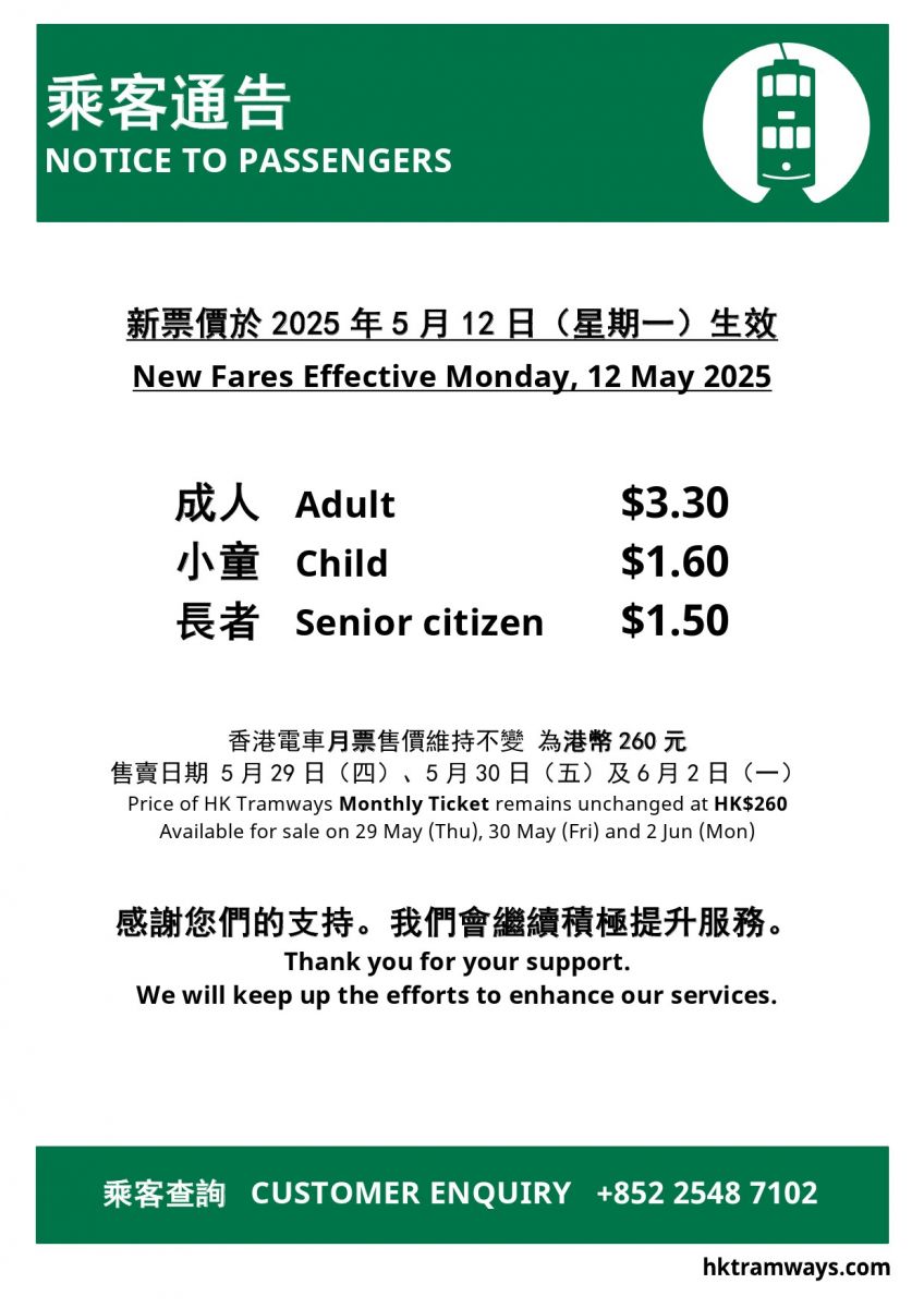 即時熱點 電車周一起加價 成人$3.3 (21:41) 發佈於 6 個月 前 2025 年 5 月 11 日 By 明報 電車新票價周一(12日)起生效,成人收費$3.3、小童$1.6、長者$1.5。電車月票售價維持$260。 相關文章:編輯推介電車電車加價 Up Next 內地實施婚姻登記全國通辦 「520」、「521」多地領證預約爆滿 (16:32) 不要錯過 天文台:母親節早上最低19°C 有驟雨及幾陣狂風雷暴 (18:06) 繼續閱讀 贊助商 猜你喜歡 中秋節|中秋交通一文睇 港鐵通宵 輕鐵電車免費搭 (09:21) 中秋免費乘車優惠 電車擴至輕鐵 與共創明Teen學員參觀輕鐵車廠 陳國基:盼學員從中發掘興趣 (17:02) 香港電車服務因變電站跳掣一度受阻 (13:41) 電車加價|有乘客感加幅可接受 有長者稱減少坐電車 (14:57) 【Emily】叮叮教道路安全 「唔睇鷺」「亂入猿」做壞榜樣
