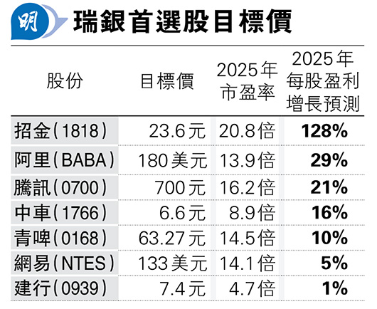 瑞銀認為,中資股已收復4月2日實施關稅措施以來所有失地,投資者或將關稅減免視為中美關係解凍迹象,輕微上調恒指目標至24,500點及MSCI中國目標至80點,預期在較低息環境下,本地地產股及高息股將跑贏大市,並繼續偏好互聯網,其中騰訊目標價700元(見表)。