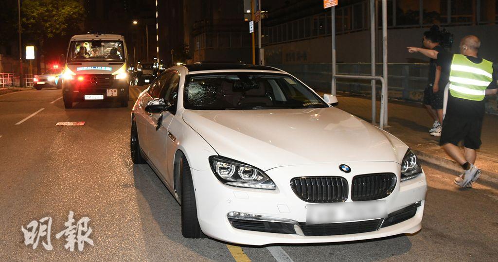 肇事私家車擋風玻璃龜裂,右側倒後鏡損毁,地上留下血迹,事發後男司機父母到場了解。