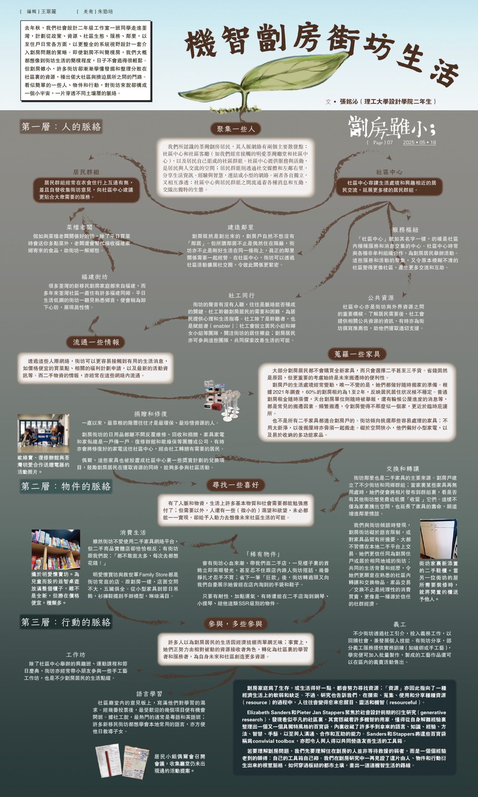 【明報專訊】去年秋,我們社會設計二年級工作室一班同學走進荃灣,計劃從政策、資源、社區生態、服務、鄰里,以至住戶日常各方面,以更整全的系統視野設計一套介入劏房問題的策略。即使劏房不叫簡樸房,我們大概都想像到街坊生活的簡樸程度,日子不會過得很輕鬆。但劏房雖小,許多街坊卻漸漸學懂發掘和整理分散在社區裏的資源,種出偌大社區與擠迫居所之間的門路。