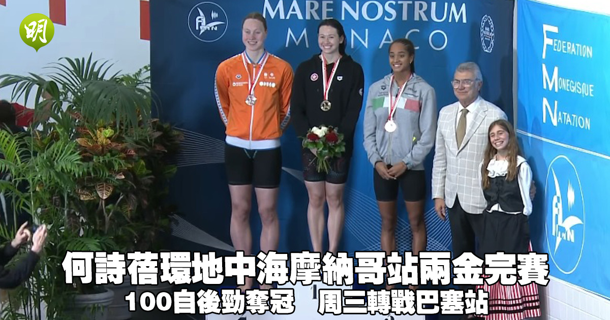「香港女飛魚」何詩蓓(Siobhan)今晨(19日)在環地中海系列賽摩納哥站再創佳績,於女子100米自由泳決賽憑後勁以53.58秒率先觸池,繼昨日200米自由泳後,在今站「復出戰」贏得兩面金牌。