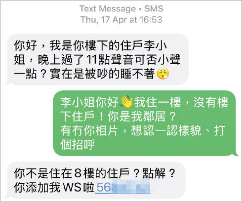 市民黃先生早前接獲懷疑由騙徒發出的短訊,發出者「李小姐」聲稱為樓下住戶,要求黃於晚上11時後收細聲量,稱「實在是被吵的睡不著」;「李小姐」之後着黃添加其WhatsApp號碼。