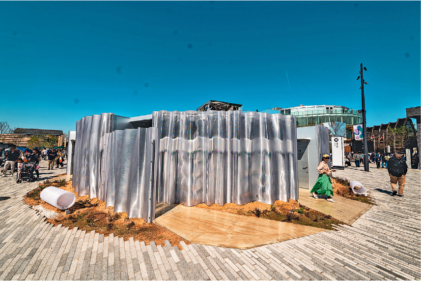 由一系列高低錯落的大小相近的全白D形模組組成,從遠處望過去,彷彿是一座微縮城市。此設計源自對「建築標準」的反思——人類的多樣性,無法再被單一模式定義。在規劃世博會廁所時,建築團隊與視障者、聽障者及坐輪椅者舉行研討會,並考慮性別、文化與宗教差異,提出新的公共設施類型學(typology)。獨立又連結的D形體,構成彼此差異卻共存的風景。廁所不再只是功能空間,而是關於共融與空間詩意的建築實驗。