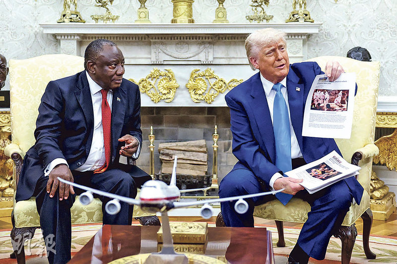 【明報專訊】南非總統拉馬福薩周三(21日)訪問白宮期間,突然遭美國總統特朗普公開指控南非存在「白人種族滅絕」情况。特朗普在會晤中展示聲稱是南非政客煽動殺害當地白人農民並強行沒收他們土地的影片及剪報。拉馬福薩冷靜應對,反駁指這並非南非政府政策,並解釋南非的謀殺案受害者大多並非白人。外界批評特朗普政府事先設局對南非作不實指控,比喻是繼烏克蘭總統澤連斯基2月底遭公開挑釁後另一場「突襲」,將令國際領袖到訪白宮前三思,以防遭到羞辱。