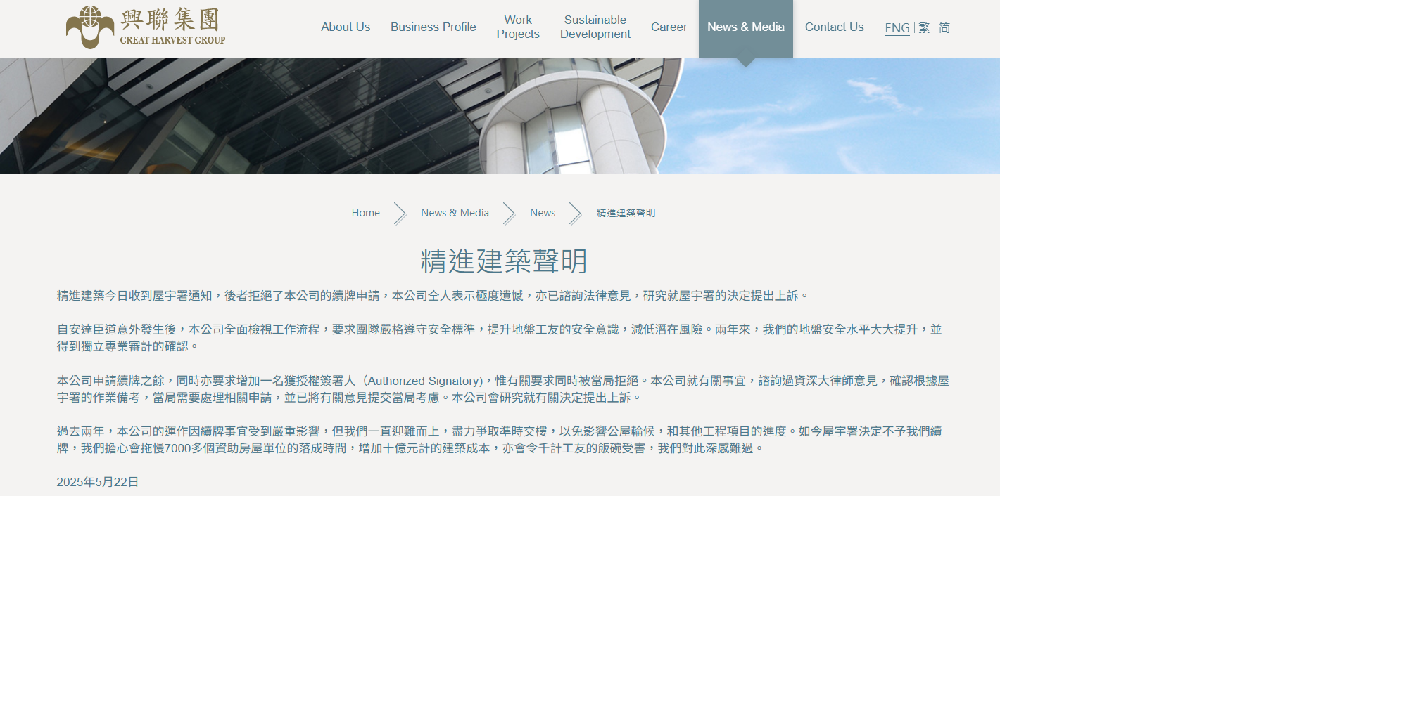 精進建築晚上在網頁發表聲明,指今日收到屋宇署通知,得悉當局拒絕續牌申請,公司仝人表示極度遺憾,亦已諮詢法律意見,研究就屋宇署的決定提出上訴。