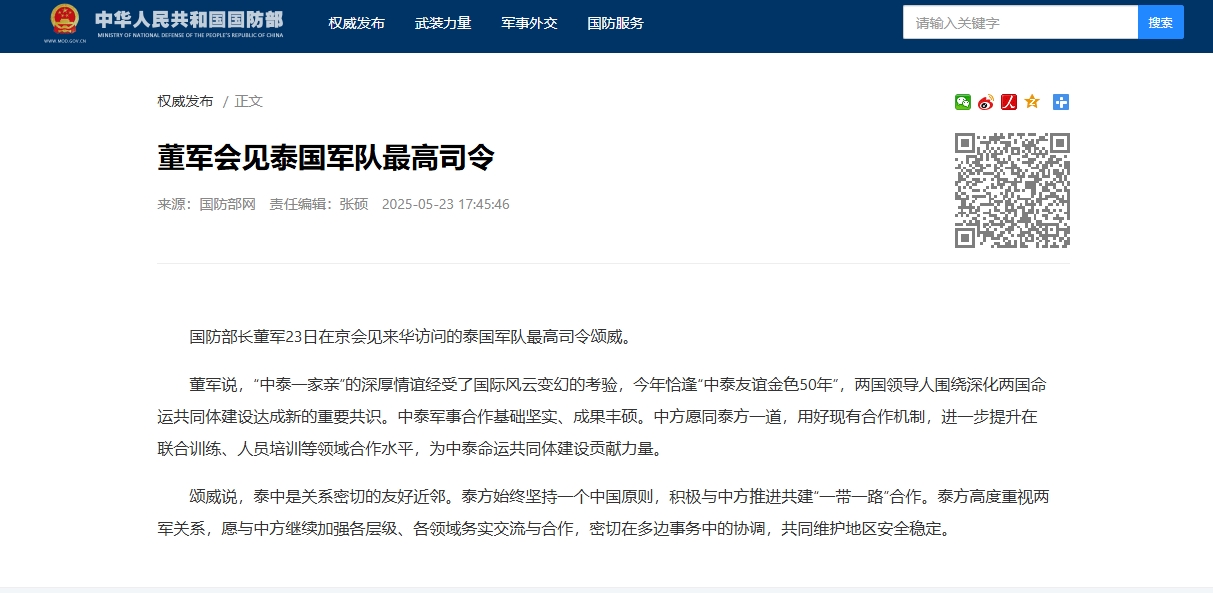 中國國防部新聞稿提到,5月22日,中央軍委聯合參謀部參謀長劉振立也同來華訪問的泰國軍隊最高司令頌威舉行會談,雙方圍繞兩國兩軍關係和國際地區形勢等共同關心的問題交換意見,就加強戰略溝通、深化聯演聯訓等合作達成重要共識。