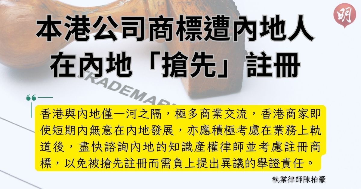 有本港公司近日在社交媒體透露,其商標早前遭一名內地人在內地「搶先」註冊。CPH Legal執業律師陳柏豪接受明報電子平台組訪問時建議,香港與內地僅一河之隔,極多商業交流,香港商家即使短期內無意在內地發展,亦應積極考慮在業務上軌道後,盡快諮詢內地的知識產權律師並考慮註冊商標,以免被搶先註冊而需負上提出異議的舉證責任。