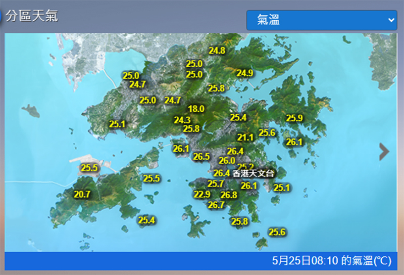 即時熱點 天氣|天文台氣溫26.4°C 相對濕度68% 局部地區有驟雨 (08:15) 發佈於 7 個月 前 2025 年 5 月 25 日 By 明報 天文台今日(25日)早上8時10分錄得氣溫26.4°C,相對濕度68%。一道廣闊雲帶正覆蓋華南。同時,一股偏東氣流影響廣東東部沿岸。本港方面,今早氣溫普遍較昨日低兩度左右。本港地區今日天氣預測:大致多雲,局部地區有驟雨。下午短暫時間有陽光,最高氣溫約29°C。吹和緩北至東北風。展望未來一兩日早上稍涼,部分時間天色明朗。周三及周四驟雨較為頻密及有雷暴。(天文台) 相關文章:天文台天氣天氣速遞編輯推介 Up Next 天氣|天文台:周一多雲有驟雨 氣溫24°C-29°C (19:14) 不要錯過 法式小酒館藏身中環半山小街 (08:26) 繼續閱讀 贊助商 猜你喜歡 天氣|天文台:周一市區16°C-20°C 多雲乾燥 相對濕度料低至45% (19:08) 天氣|天文台:今日大致多雲非常乾燥 市區氣溫料16°C-20°C (09:40) 天文台:冷鋒稍後橫過廣東沿岸 周日早上市區最低14°C (12:22) 天氣|天文台:多雲有陣雨 午夜氣溫低至16°C (10:07) 天氣|天文台:周六多雲有雨 日間最高22℃ 午夜跌至16℃ (21:48) 天氣|天文台:天晴乾燥最高24°C 明日氣溫顯著下降 (08:43)