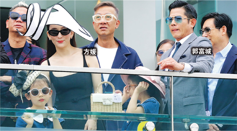 郭富城昨日偕方媛和兩女到沙田馬場,一家四口戴墨鏡亮相為愛駒「舞林密碼」出戰打氣。郭富城心情不錯滿場飛,見有人拍照保持笑容,戴帽的方媛穿上黑色吊帶連身裙,身材比之前豐腴滲孕味。郭富城舉家入馬場支持,惜未能拉頭馬,「舞林密碼」以第二名完成賽事。另外,「大美人」關之琳亦現身馬場支持朋友的愛駒出賽,開心拉頭馬。