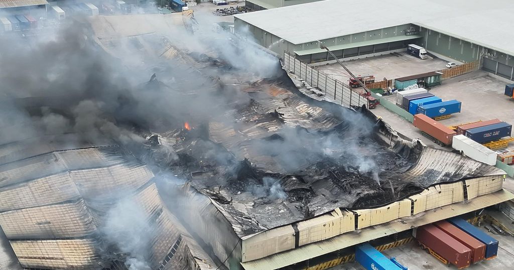 今晨起火貨倉仍有濃煙不斷冒出,消防升起雲梯從多角度射水灌救,貨倉部份由鋅鐵蓋搭屋頂,被大火燒至塌下。