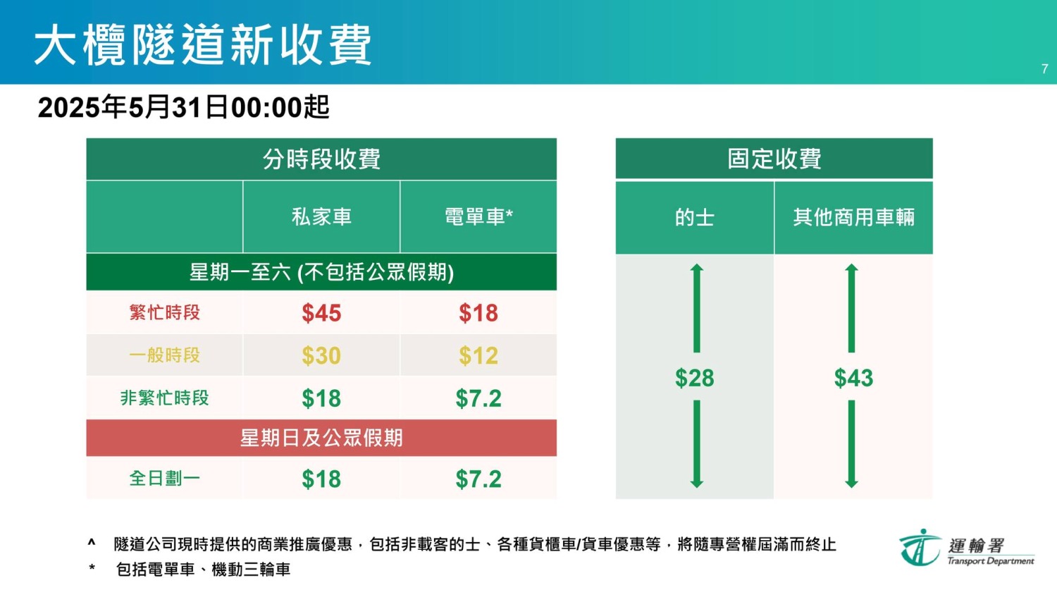 所有日子固定收費:的士28元,其他商用車43元