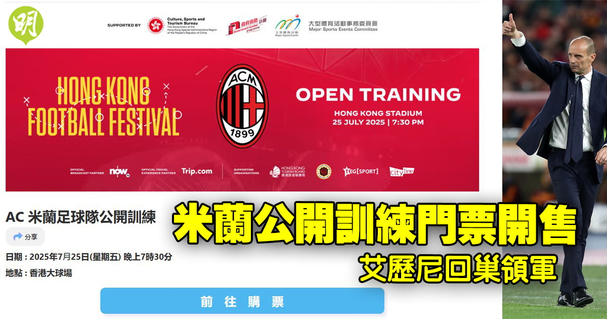 意甲球隊AC米蘭將於今年7月26日於啟德主場館舉行的「香港足球盛會2025」,與應屆英超冠軍的利物浦爭奪「渣打盃」,主辦方今午(30日)宣布「紅黑軍」公開訓練的門票正式公開發售,票價劃一為199元。不過,球會同日宣布解僱僅上任半年的葡萄牙籍主帥干斯卡奧,並由意大利籍前帥艾歷尼回巢接掌。