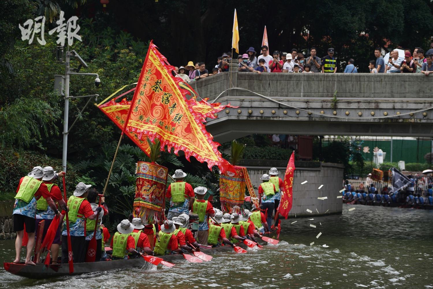 593歲的「鹽步老龍」如約而至,這是廣佛情誼的象徵。傳說明朝萬歷年間,兩龍競渡,謙讓結親,鹽步為「契爺」,泮塘為「契仔」,從此簪花掛紅、互贈標旗,書寫了「長幼有序、和諧共處」的龍舟精神。(明報記者)