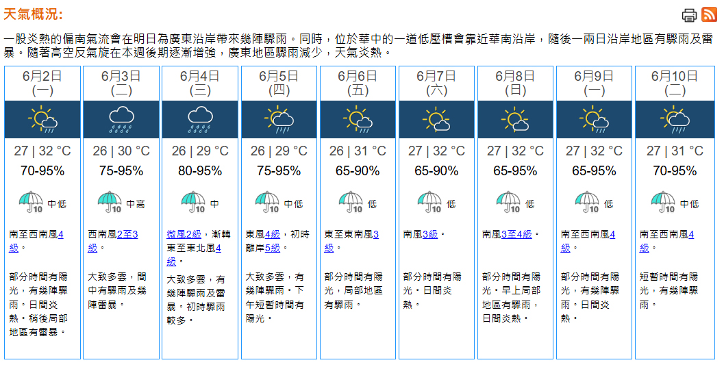 即時熱點 天氣|天文台:周一市區氣溫料最高32°C 有驟雨局部地區有雷暴 (18:41) 發佈於 7 個月 前 2025 年 6 月 1 日 By 明報 一股偏南氣流正逐漸影響廣東沿岸。本港方面,下午大部分地區氣溫上升至31°C左右。本港地區今晚(6月1日)及明日(6月2日)天氣預測:大致多雲,明日有幾陣驟雨,早上最低氣溫約27°C,日間部分時間有陽光及炎熱,市區最高氣溫約32°C,新界再高一兩度,稍後局部地區有雷暴。吹和緩南至西南風。展望周二(6月3日)及周三(6月4日)間中有驟雨及幾陣雷暴。本周後期驟雨逐漸減少,接近周末部分時間有陽光及炎熱。(天文台) 相關文章:天文台天氣天氣速遞編輯推介驟雨 Up Next 海運戲院|短片:海運戲院最後一夜 戲迷入場睇《半斤八両》話當年 (22:00) 不要錯過 天氣|天文台:今日局部地區有驟雨 周一至周三有雷暴 (08:30) 繼續閱讀 贊助商 猜你喜歡 天氣|天文台:周一市區16°C-20°C 多雲乾燥 相對濕度料低至45% (19:08) 天氣|天文台:今日大致多雲非常乾燥 市區氣溫料16°C-20°C (09:40) 天文台:冷鋒稍後橫過廣東沿岸 周日早上市區最低14°C (12:22) 天氣|天文台:多雲有陣雨 午夜氣溫低至16°C (10:07) 天氣|天文台:周六多雲有雨 日間最高22℃ 午夜跌至16℃ (21:48) 天氣|天文台:天晴乾燥最高24°C 明日氣溫顯著下降 (08:43)