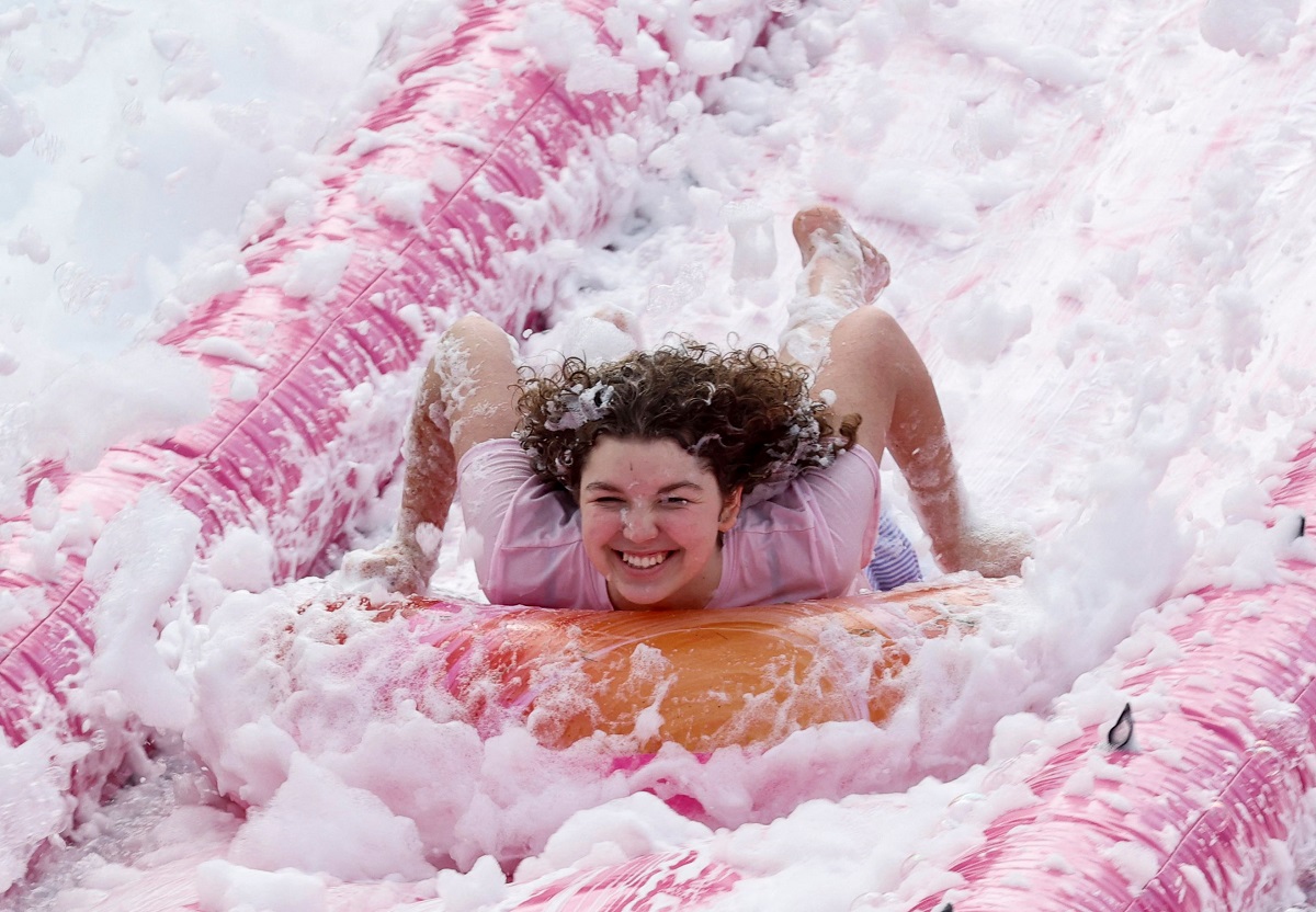 「粉紅湯滑梯」是節日的經典設施,50米長的巨型充氣滑梯噴上泡沫,讓民眾滑入裝滿粉紅泡棉的大型「湯碗」,深受年輕族群喜愛。