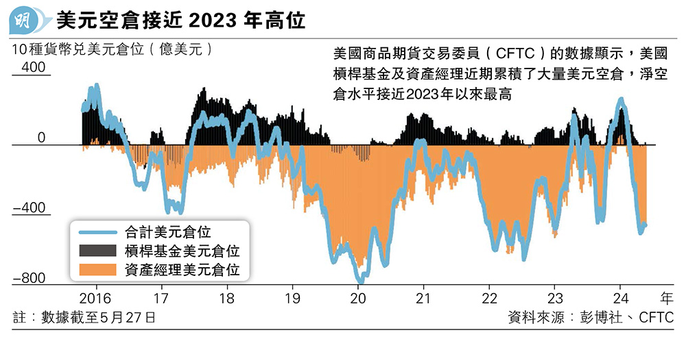 由Matthew Hornbach為首的摩根士丹利分析師發表的報告預期,利率和貨幣市場已開啟可持續的重大趨勢,在歷經過去兩年大幅區間波動後,美元將進一步下滑,而孳息率曲線將更為陡峭。美國商品期貨交易委員會(CFTC)的交易數據亦顯示,槓桿基金和資產經理近期累積的美元空倉倉位,接近2023年高位(見圖)。