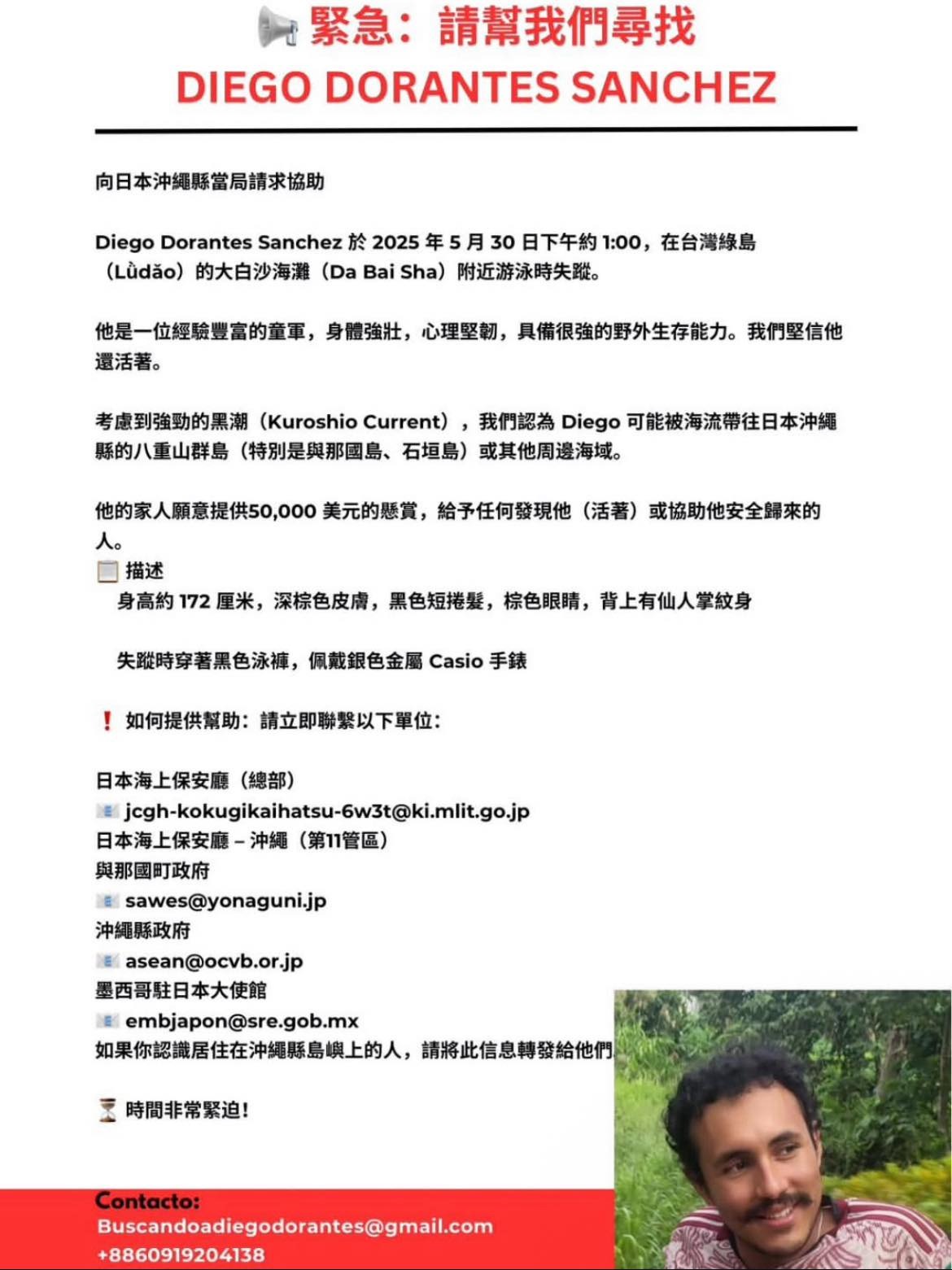 根據其親友在社交平台指,Diego身高約1.72米,深棕色皮膚、黑色短捲髮及背上有仙人掌紋身;他於5月30日下午1時左右在台灣綠島大白沙灘附近游泳時失蹤,失蹤時身穿黑色泳褲。親友近日在網路呼籲協助尋找並懸賞5萬美元,亦指日本海上保安廳(沖繩支廳)已確認知悉此事,惟未有台灣當局正式請求搜救則無法執行,促台灣當局與日本相關部門聯繫,請求國際搜救 (SAR)行動。