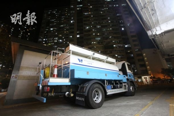 【21﹕30更新】屯門三聖街有水管滲漏,水務署稍後會進行維修工作,食水供應則維持正常至今晚11時。今日(2日)晚上,水務署派出水車到三聖邨外,並擺放大型水缸供市民取水,但暫時未見有人取水。