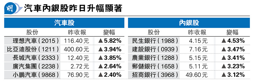 內地傳媒報道,全國工商聯汽車經銷商商會(全聯車商)提出,堅決抵制以「價格戰」為主要形式的「內捲式」競爭行為,並呼籲改善汽車經銷商的生存狀况,不得向經銷商轉嫁庫存、強迫經銷商進車,切實降低經銷商庫存水平。車股做好,理想汽車 (2015) 升近6%,為表現最好藍籌;小米升3%;比亞迪(1211)止跌反彈近4%;長城(2333)升近4%;廣汽(2238)、小鵬(9868)升逾2%。