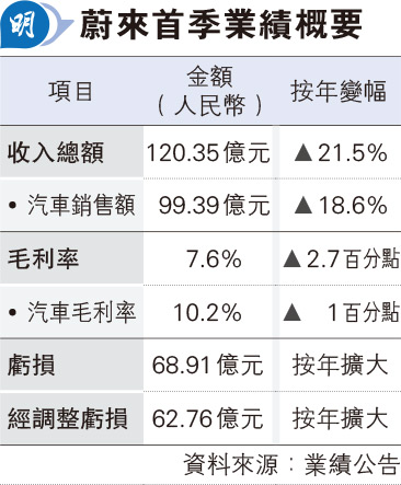 【明報專訊】蔚來(9866)首季收入按年升21.5%至120.35億元(人民幣,下同),低於市場預期的123.5億元。虧損擴大至68.91億元,去年同期虧損52.58億元;經調整虧損亦由去年的48.97億擴大至62.76億元,遠高於預期51.89億元的虧損。蔚來美股開市早段微升,較本港收市價高逾1%。
