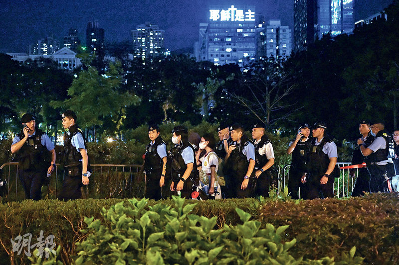 另晚上7時許,有4人走入維園,其中有兩個穿校服女生手持白花束,4人均遭警員截查帶走;約8時半,有手持花束情侶途經維園通道被截查後獲放行。