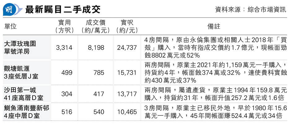 【明報專訊】「收租王」永倫集團近期頻頻沽貨,部分更屬大幅蝕讓,其中該集團或相關人士,上月以8198萬元售出大潭玫瑰園一幢洋房,雖然較今年3月同類單位做價高約5%,但持貨約7年,帳面仍蝕8802萬元,蝕幅高達52%。