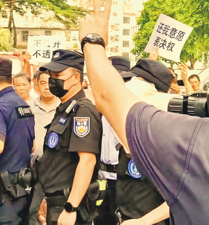 【明報專訊】廣東省廣州天河元崗村反強拆抗議持續,村民昨(4日)持「還我表決權」等標語在村委會門口聚集。村民表示,村委會此前承諾會在上午11時回應,村民等了半天等不到村領導,傍晚等來增援的警察將其驅散。村民表示,不同意人數達全村成年村民三分之一後,村委會就不再向沒有明確表態同意拆遷的村民派發舊村改造意願書。據內地關法律法規,拆遷方案獲三分之二多以上村民同意即可通過。