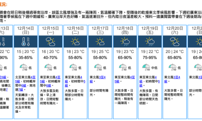 即時熱點 天氣|天文台:市區最高32°C 未來數日持續酷熱 (10:21) 發佈於 6 個月 前 2025 年 6 月 7 日 By 明報 早上10時,天文台錄得氣溫30°C,相對濕度70%。 本港今日(7日)天氣預測大致天晴,天氣炎熱,市區最高氣溫約32°C,吹輕微至和緩偏南風。天文台提醒,天氣炎熱可能影響健康,市民應保持警惕,多補充水分。展望未來數日持續酷熱,大致天晴,下周後期有幾陣驟雨。(天文台) 相關文章:天文台天氣天氣速遞 Up Next 月夜下到JCCAC睇戲 (09:30) 不要錯過 賞花|短片:粉嶺臘腸樹黃花綻放如「黃金雨」 (11:18) 繼續閱讀 贊助商 猜你喜歡 天氣|天文台:周一市區16°C-20°C 多雲乾燥 相對濕度料低至45% (19:08) 天氣|天文台:今日大致多雲非常乾燥 市區氣溫料16°C-20°C (09:40) 天文台:冷鋒稍後橫過廣東沿岸 周日早上市區最低14°C (12:22) 天氣|天文台:多雲有陣雨 午夜氣溫低至16°C (10:07) 天氣|天文台:周六多雲有雨 日間最高22℃ 午夜跌至16℃ (21:48) 天氣|天文台:天晴乾燥最高24°C 明日氣溫顯著下降 (08:43)
