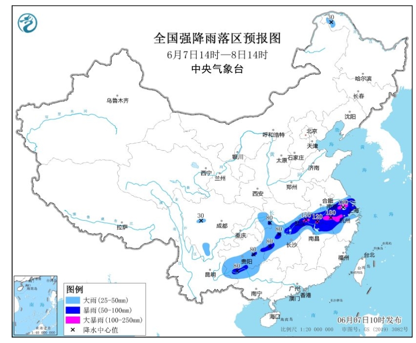 6月7日下午2時起,24小時內江淮南部、江漢東南部、江南北部、貴州中南部、廣西西北部等地部分地區有大到暴雨,其中安徽南部、江蘇南部、湖北東部、浙江西北部等地部分地區有大暴雨。
