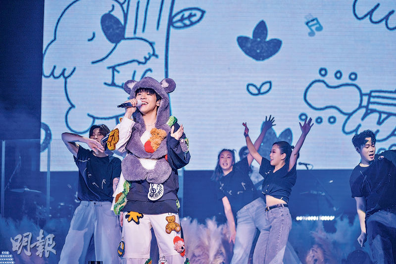 【明報專訊】陳卓賢(Ian)日前到澳洲墨爾本舉行個人演唱會,他以電結他自彈自唱《Lost at first sight》為巡唱揭開序幕,台下粉絲不停尖叫。Ian在演唱會上穿著無尾熊衫,加上愛犬「雞髀」公仔,更將衫的上半身改成有手有腳的無尾熊,當他戴上帽後便完全變身無尾熊,被笑稱無尾熊返家鄉。