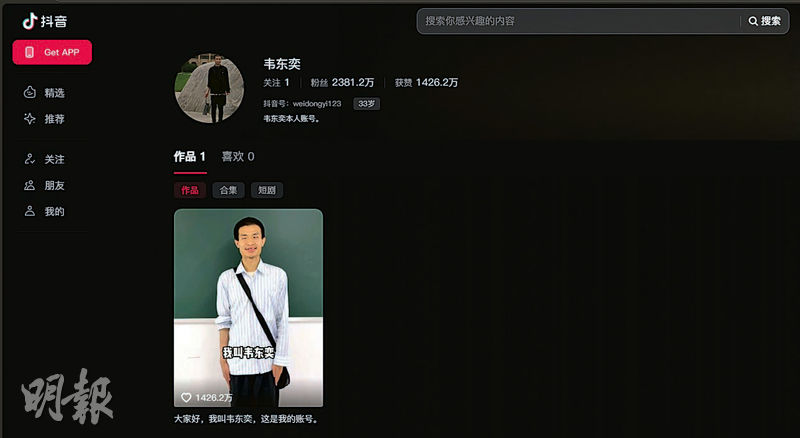 今年高考前夕,韋東奕6月4日在抖音發片。他在黑板前筆直站立,自我介紹「大家好,我叫韋東奕,這是我的帳號」,該條至昨日唯一短片,時長4秒,已為他帶來近2400萬粉絲。不過短片顯示韋東奕有部分牙齒脫落,引發粉絲呼籲北大關注教師健康。