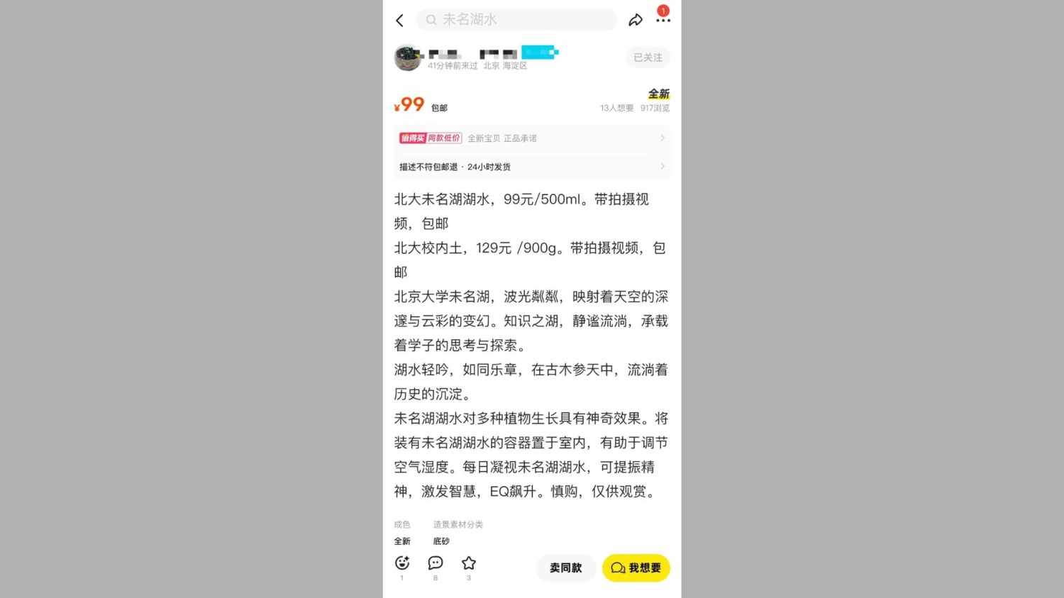 即時兩岸 北大湖水疑遭盜取出售 一樽百元聲稱「凝視湖水激發智慧」 (14:03) 發佈於 5 個月 前 2025 年 6 月 10 日 By 明報 內地高考期間,內地網上二手交易平台湧現多個商家售賣北京大學未名湖湖水,每樽(500毫升)標價20元到近百元不等,附有拍攝短片證明,速遞包郵外地。 商家介紹稱:「未名湖湖水對多種植物生長具有神奇效果。將裝有未名湖湖水的容器置於室內,有助於調節空氣濕度。每日凝視未名湖湖水,可提振精神,激發智慧,EQ飆升。慎購,僅供觀賞。」 6月10日,北京大學保衛部工作人員回應稱,學校不允許取用未名湖水售賣,將聯繫商家下架商品。(新京報) 相關文章:北大編輯推介高考 Up Next 印度海域爆炸貨櫃輪有2名台灣船員失蹤 (02:28) 不要錯過 原「610辦公室」副主任高以忱受查 (17:27) 繼續閱讀 贊助商 猜你喜歡 藏語文被移除高考科目 西藏自治區主席:實現學生成才和社會公平 (16:07) 灣區熱搜:首年在粵招80生 設5本科專業 大灣區大學開放日 高考生:師資吸引 宇樹創辦人鼓勵高考生報讀機械專業 官方發現高考材料造假 品牌急與那爾那茜割席 高考未結束 高考詐騙短訊湧現 (01:04) 安徽五胞胎參加高考 高中免50萬費用惹議