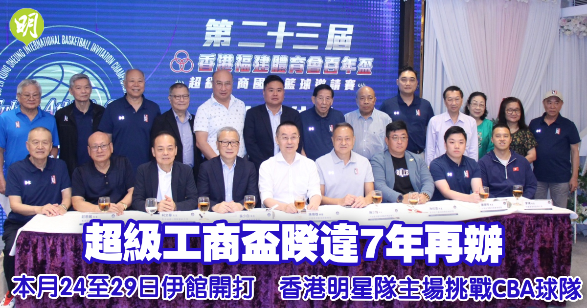 超級工商國際籃球邀請賽暌違7年,本月24至29日將在灣仔伊利沙伯體育館復辦,為慶祝香港福建體育會成立100周年,今屆賽事獲冠名為「香港福建體育會百年盃」。香港籃總將派出中國香港明星隊出戰,並在分組賽與中國男子職業籃球聯賽(CBA)球隊天津先行者、廣東隊及新加坡隊爭出線。
