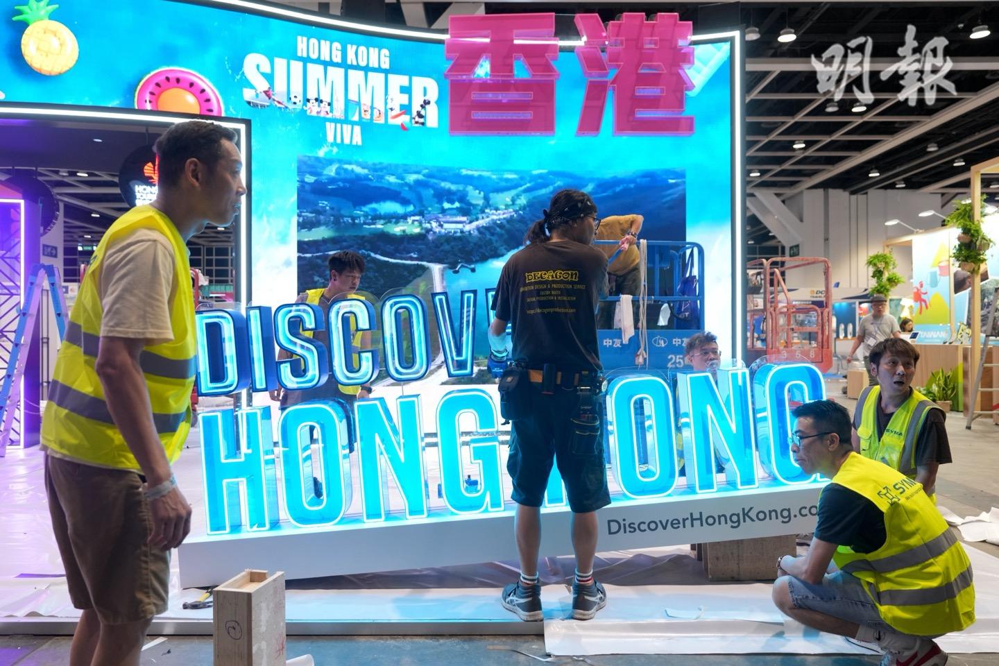 一連4天的香港國際旅遊展明(12日)起在灣仔會展舉行,吸引約500個國際展商參展,今日不少展商正密鑼緊鼓搭建攤位。有觀光局期望透過展覽加深港人對塞班島的認識;有旅行社冀4天展期人流暢旺。