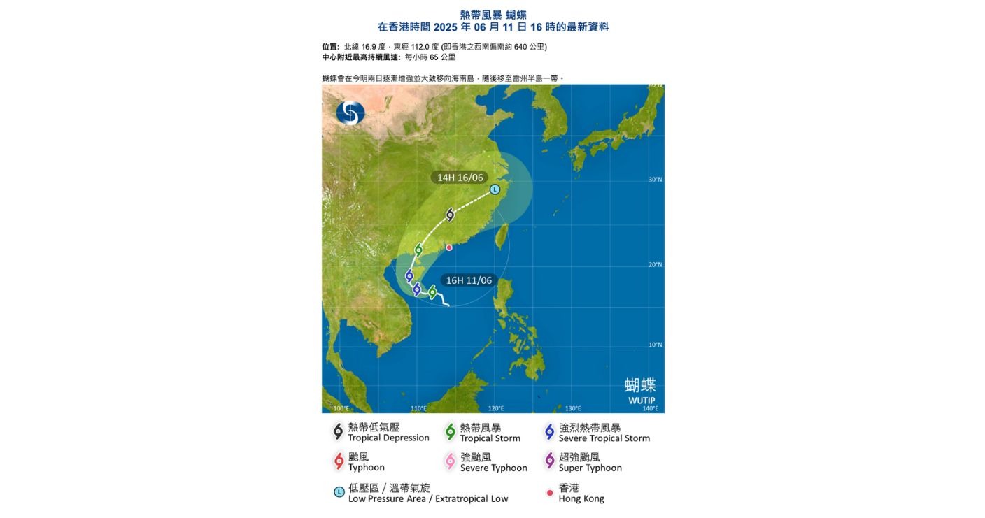 天文台表示,與熱帶氣旋「蝴蝶」相關的狂風驟雨正影響廣東沿岸。同時,「蝴蝶」正在整合中,在其廣闊環流與中國東南沿岸高壓脊的共同影響下,本港今晚(11日)至明日(12日)初時部分地區間中吹偏東強風,除非「蝴蝶」迅速增強及本地普遍持續吹強風,一號戒備信號會在今晚及明早維持。