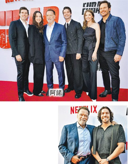 【明報專訊】《未來戰士》「大隻佬」阿諾舒華辛力加(Arnold Schwarzenegger)伙拍《壯志凌雲:獨行俠》女星蒙妮卡芭芭露(Monica Barbaro)主演的影視串流平台Netflix劇集《FUBAR》兩年前首播,第2季昨上架,前日在洛杉磯舉行首映禮,除了蒙妮卡芭芭露等劇中演員,阿諾全家到場以示支持,包括長女嘉芙蓮、女婿兼《銀河守護隊》基斯柏特(Chris Pratt)、二女姬絲汀娜、三仔兼《白蓮會3》男星柏德烈、么兒基斯杜化等;衆人更在紅地氈拍攝全家福。其實阿諾與女傭所生的私生子約瑟夫(Joseph Baena)也有到場,卻未能「融入」阿諾前妻瑪麗亞施賴弗(Maria Shriver)所生的子女群,無份拍全家福。不過阿諾都有照顧兒子感受,另外與他及其女友合照。