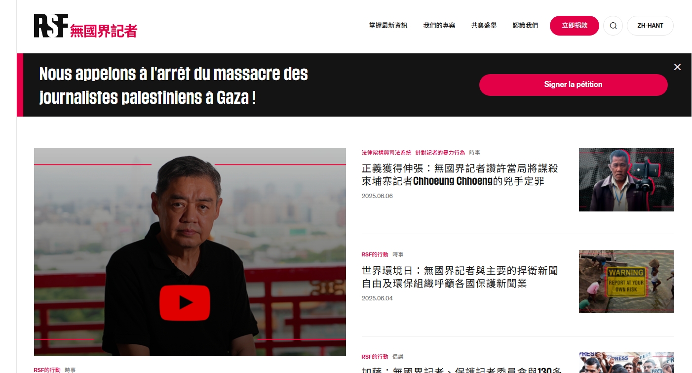 即時兩岸 無國界記者推出中文網 (20:07) 發佈於 5 個月 前 2025 年 6 月 12 日 By 明報 無國界記者(RSF)官網6月10日公告宣布推出中文版網站,稱讓中文使用者能取得世界各地新聞自由狀況的可靠資訊。 這是該機構繼法文、英文、西班牙文、葡萄牙文、阿拉伯文和波斯文版本後,推出中文網。 公告稱,中文網站是無國界記者全球戰略的一環,記錄政府侵犯新聞自由的行為、支援遭受威脅的記者並繞過審查機制,讓14億中文使用者可取得相關資訊。 無國界記者呼籲,國際社會須增加對中國政府施壓,「迫其終止系統性侵犯新聞自由的行為,並釋放所有遭不當監禁的記者」。(中央社) 相關文章:新聞自由無國界記者中文網 Up Next 回應林運團就任福州輔理主教 中國外交部:中梵臨時協議順利實施 (00:51) 不要錯過 國務院舉行憲法宣誓儀式 總理李強監誓 (21:16) 繼續閱讀 贊助商 猜你喜歡 華府斷經費衝擊 自由亞洲電台停播新聞 土耳其政府接管親反對派電視台 五角大樓禁發布未授權信息 阻記者擅離指定區 全球新聞自由過去5年大倒退 50年來最差 以媒:以軍設專隊誣衊巴人記者 堅守加沙報道 巴人記者遭以軍炸死 以方指哈馬斯成員 半島電視台轟為滅聲