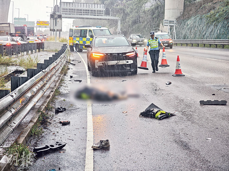 現場消息稱,事發前電單車原停在橋底路肩,懷疑司機穿著雨衣後駛出慢線,駛至的貨櫃車急扭右軚閃避,電單車繼續切出中線,被貨櫃車撞倒推行,鐵騎士捲入車底拖行約100米,貨櫃車再與快線的私家車相撞,電單車夾在貨櫃拖頭前,鐵騎士則倒臥貨櫃車與私家車之間。