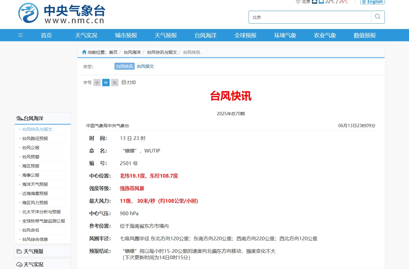 即時兩岸 颱風「蝴蝶」拐彎登陸海南東方市 (23:26) 發佈於 5 個月 前 2025 年 6 月 13 日 By 明報 中央氣象台6月13日深夜通報,颱風「蝴蝶」晚上11時位於海南省東方市境內,強度由颱風級降為強熱帶風暴級,中心最大風力11級(最高風速約108公里/小時)。 預計「蝴蝶」將以15至20公里時速向北偏東方向移動,趨向粵桂沿海。 此前「蝴蝶」預計登陸海南南部,13日未按照預測路徑,繞過海南島西部近海緩慢北上,晚上8時增強為颱風級。到11時突然折向海南島登陸東方市八所鎮。(中央氣象台) 相關文章:東方市登陸海南編輯推介颱風蝴蝶 Up Next 實習醫生羅帥宇「被自殺」輿論風暴 湖南長篇調查報告:家屬指控不實 (01:37) 不要錯過 中國沿海9城成立「郵輪+消費城市聯盟」 (16:52) 繼續閱讀 贊助商 猜你喜歡 南海熱帶低壓最快今晚登陸 強度維持 (00:58) 南海低壓趨向海南周五登陸 料24小時內成今年第一號颱風 (16:49)