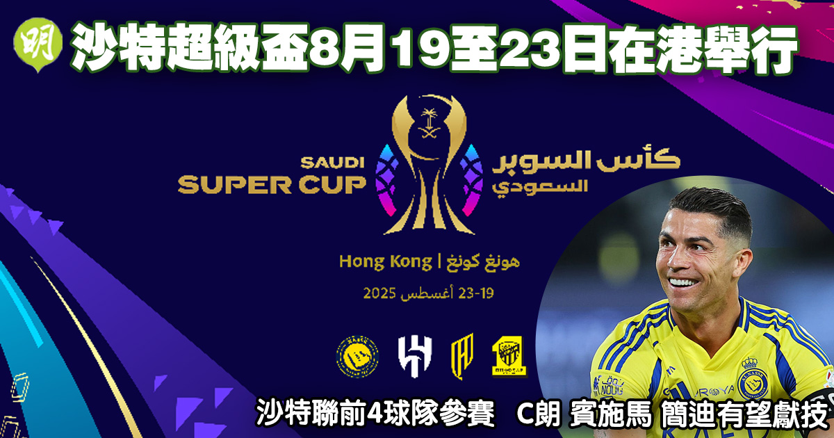沙特足總今(14日)宣布,2025年沙特超級盃將於8月19日至23日首次在香港舉行,參賽為今季沙特聯前4名球隊伊蒂哈德、希拉爾、艾納斯及艾卡迪沙。換言之,效力艾納斯同40歲葡萄牙球星基斯坦奴朗拿度(C朗),聯同賓施馬、尼高路簡迪等球星均有機會隨隊東來獻技。