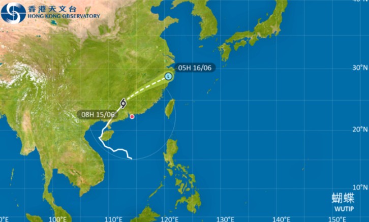 今早蝴蝶繼續減弱,但與其相關的強風區仍影響珠江口一帶。現時本港多處吹強風,高地間中吹烈風,而蝴蝶的外圍雨帶亦正為廣東沿岸帶來狂風驟雨。預料蝴蝶今早(15日)會繼續向東北橫過廣東內陸,與本港保持約300公里距離,三號強風信號會至少維持至今日中午。隨着蝴蝶逐漸遠離及減弱,預料本港今日下午的風力會逐步緩和。天文台會視乎本港的風力變化及蝴蝶在內陸的減弱程度,考慮改發一號戒備信號,或以強烈季候風信號取代熱帶氣旋警告信號。海面有大浪及湧浪,市民請遠離岸邊並停止所有水上活動。(天文台)