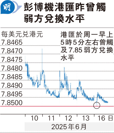 【明報專訊】港元拆息持續低迷,沽港元、買美元套息交易有增無減。據彭博終端機顯示,港匯昨日凌晨5時05分,報價曾觸及7.85弱方兌換保證水平(見圖),為繼2023年5月4日之後首次觸及弱方。但根據路透社報價系統顯示,港匯未曾觸及弱方水平,有外匯交易員亦表示,港匯昨日並未觸及7.85弱方。